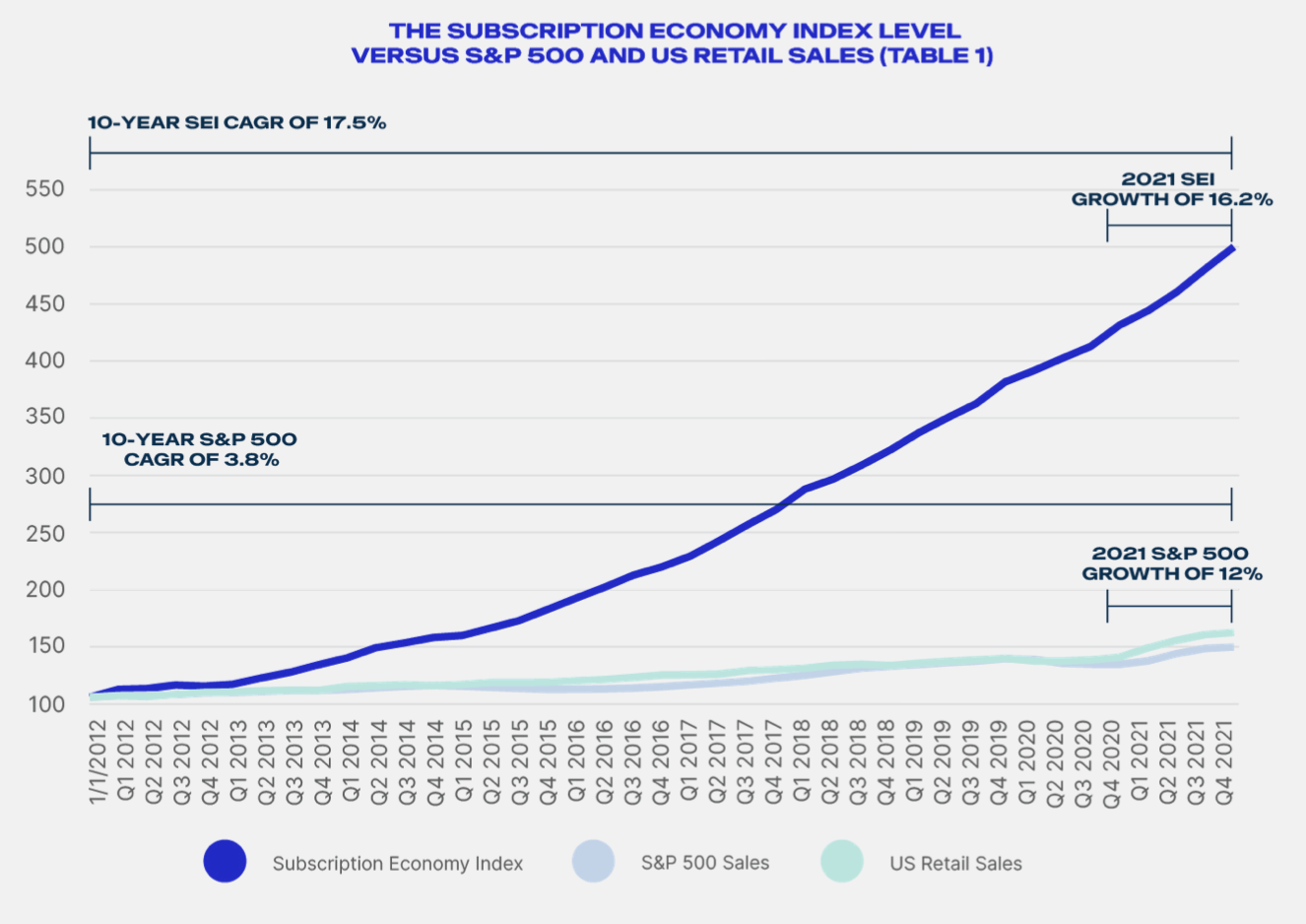 Above: Over the past 10 years, Subscription-oriented businesses have grown at nearly 5X the annual growth rate of the S&P 500.