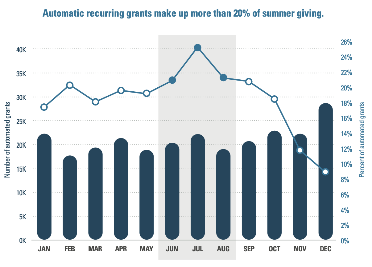 Above: Recurring DAF donors still give even when other giving slows. In the critical summer months, Vanguard Charitable found that automatic recurring grants make up more than 20% of summer giving.