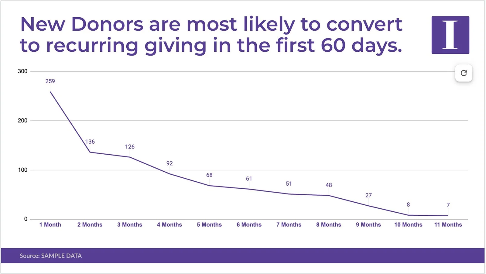 💡 Takeaway: New donors are at the height of interest and passion in your cause after making their first gift. How can you affirm them and show how their gift made a difference? Likewise, how can you invite them to make an impact through sustained recurring giving?